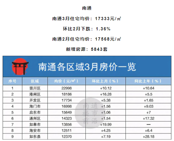 本月南通各区域全面上涨,其中如皋市涨幅较大,环比上月上涨高达19.99%,成为南通市一匹黑马。此外,原港闸区上涨幅度也达到了16.28%,但依然无法撼动崇川区的龙头位置。