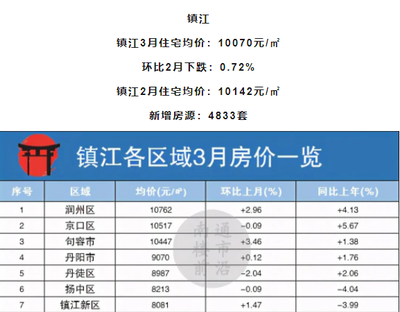 镇江本月4区域上涨3区域下跌,其中,句容市上涨幅度较高,环比上月上涨3.46%。