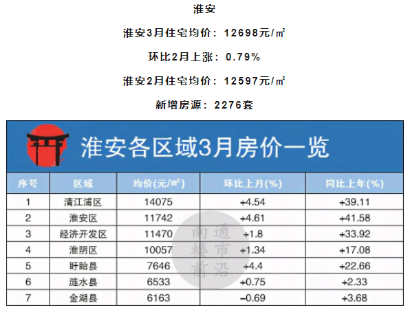淮安本月仅1区域下跌,金湖县环比上月下跌0.69%,幅度不大,其他区域均为上涨趋势,另外,淮安区上涨幅度较高,环比上月上涨4.61%。