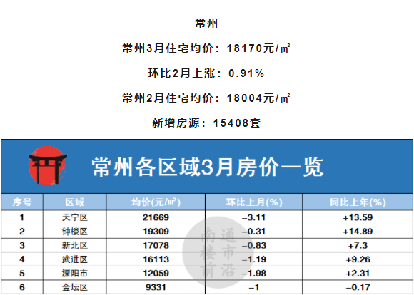 单从区域上来看,常州本月各区域均呈下跌趋势,但降幅不大,天宁区环比上月下跌3.11%,为本月常州降幅较大区域。