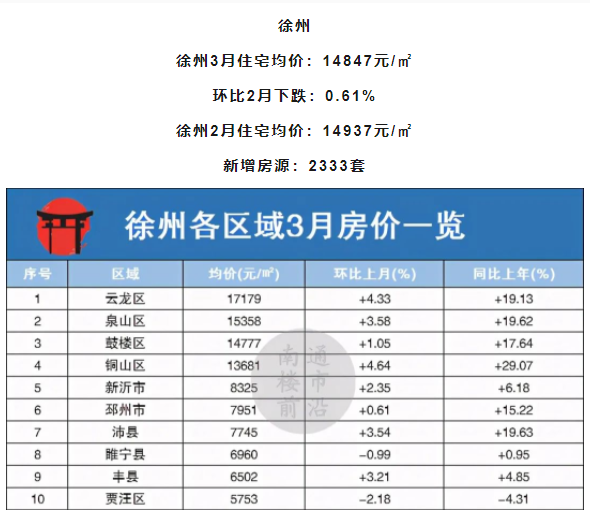 徐州本月仅2区域城下跌趋势,其他8地均为上涨,其中铜山区涨幅较高,环比上月上涨4.64%。