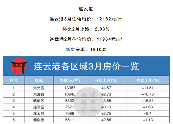 连云港本月除赣榆区外,其他区域均为上涨趋势,赣榆区环比上月下跌3.55%。