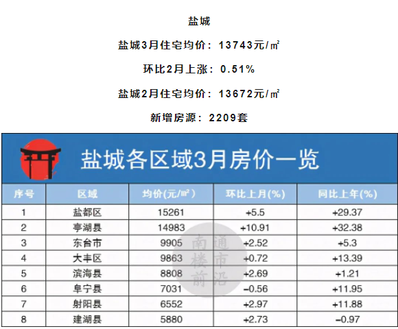 盐城本月除阜宁县轻微下跌外,其他区域均呈上涨趋势,其中,亭湖县涨幅较高,环比上月上涨10.91%。