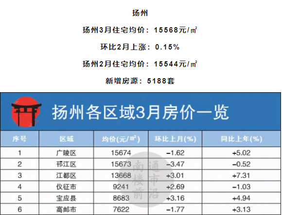 扬州本月各区域涨跌较为均匀,3区降,3区涨,其中,邗江区降幅较大,环比上月下跌3.47%,宝应县涨幅较高,环比上月上涨3.16%。