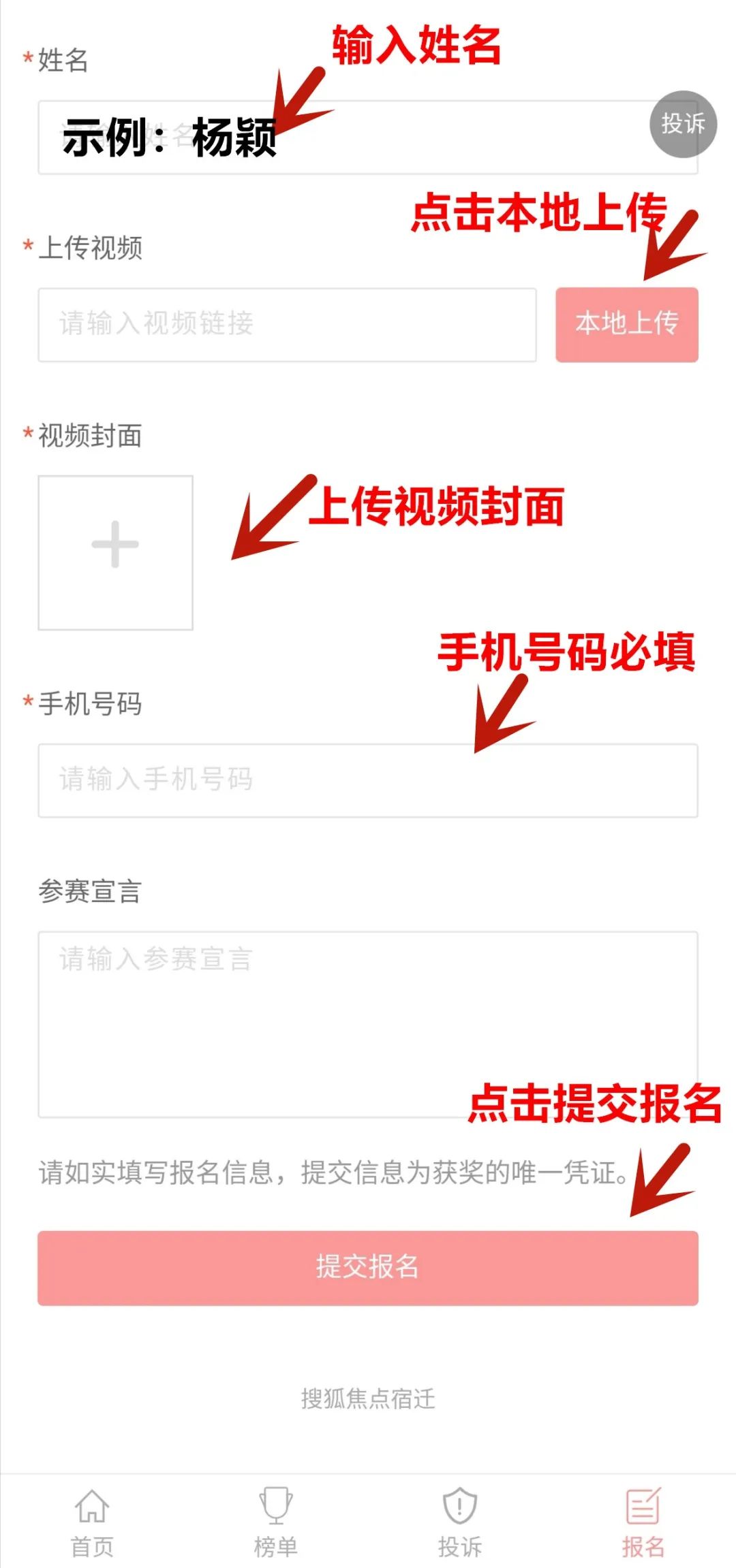 3、根据报名要求进行填写相关信息:姓名+电话+上传视频=报名成功;