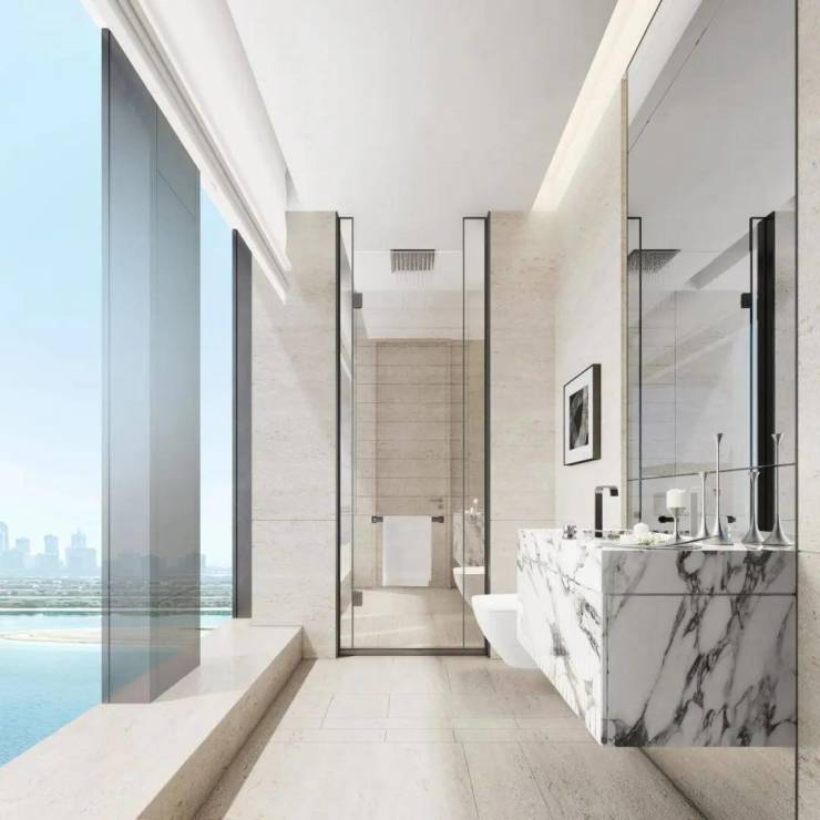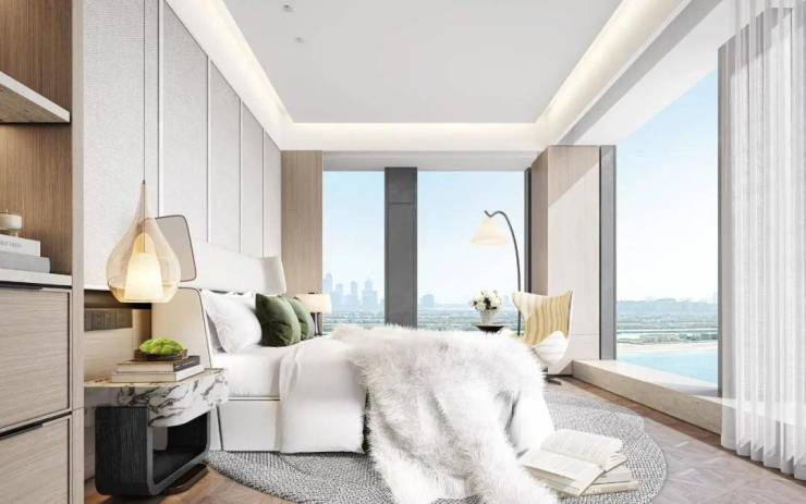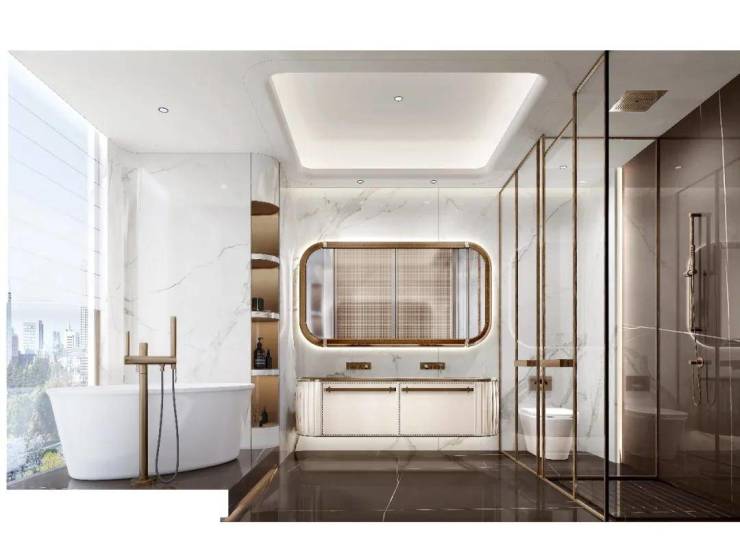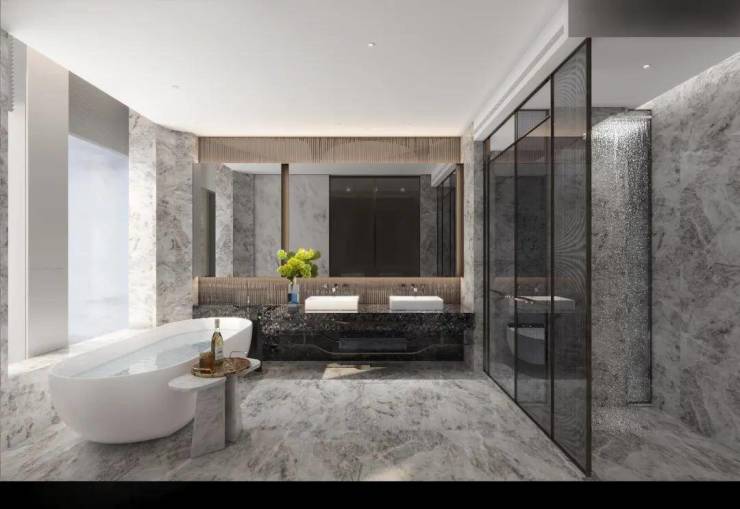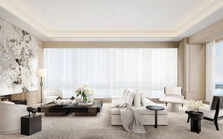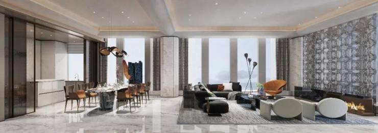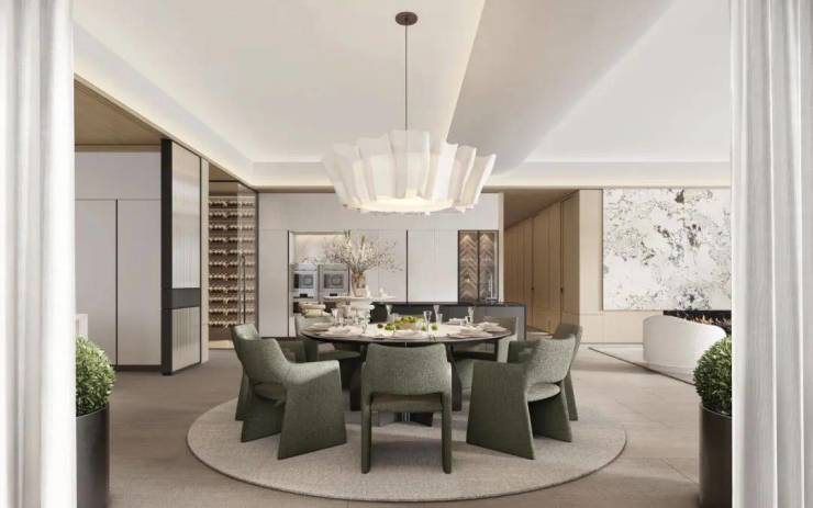 室内设计上,采用LDK一体化设计,带来极具阔正的空间尺度,并以大面米灰、暖灰为主基调,营造出高级优雅的氛围感,同时通过吊灯、艺术玻璃、酒柜等软装艺术作点缀,将艺术与生活融合,简奢中透出时尚前卫,营造出私密、温暖、现代化、国际化及独特的鼎级舒居体验。