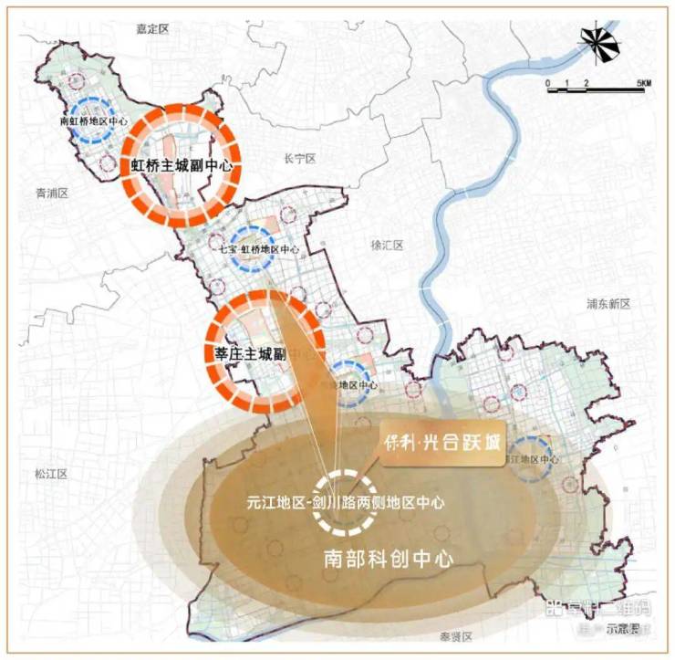 作为上海全球城市五大主城片区之一,闵行主城以其南部单元担当上海南部科创中心核心区,与虹桥同频,形成南北联动发展格局,成为上海版图中心 “金钥匙”。元江路-剑川路地区中心是闵行五大中心之一,能级比肩漕河泾、张江,与梅陇、七宝共筑闵行TOD金三角。