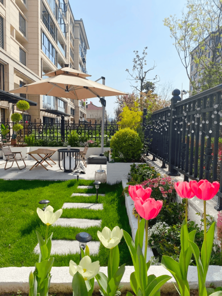 丰富的园区背景,在阳光下折射出满满的生命力,搭配极具层次感的绿化,整个空间十分灵动,未来这里也能成为每个小业主的植物园。