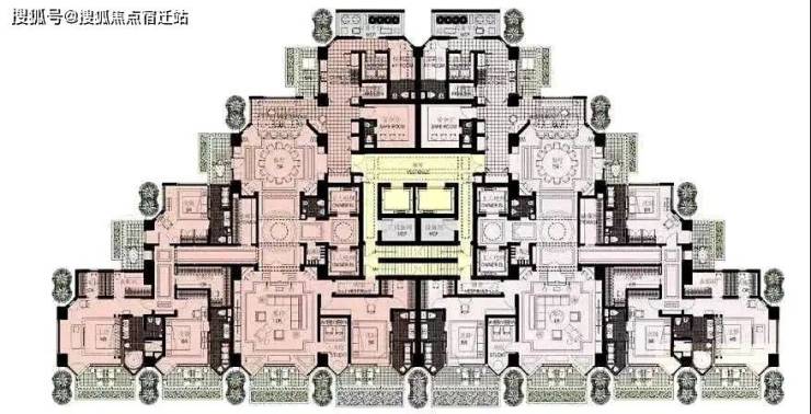 项目独特的金字塔户型设计,仪式感超强:南侧住宅平面采用了三角形造型,四间豪华套房,超大客餐厅,充分利用南向面宽,不浪费一丝一毫江景,并且每个房间都有超大阳台。