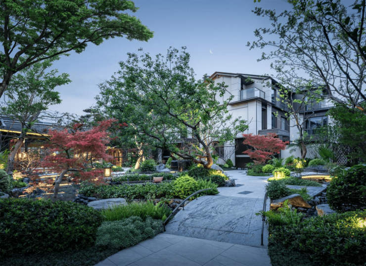庭院由香山帮匠人合力打造,工艺与古法一一对应,传承2500多年非遗营造技艺,将中国人骨子里的院落情怀落地。推开宅院大门,“室内桥”设计,涓涓流水入宅,营造别致流水景观。假山叠瀑、自然水系、东方韵味的美人靠等景观合围,院中大树乌桕,庭院深深,目之所及是浓缩数千年的时空画面。