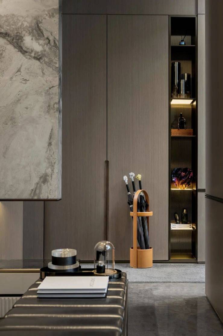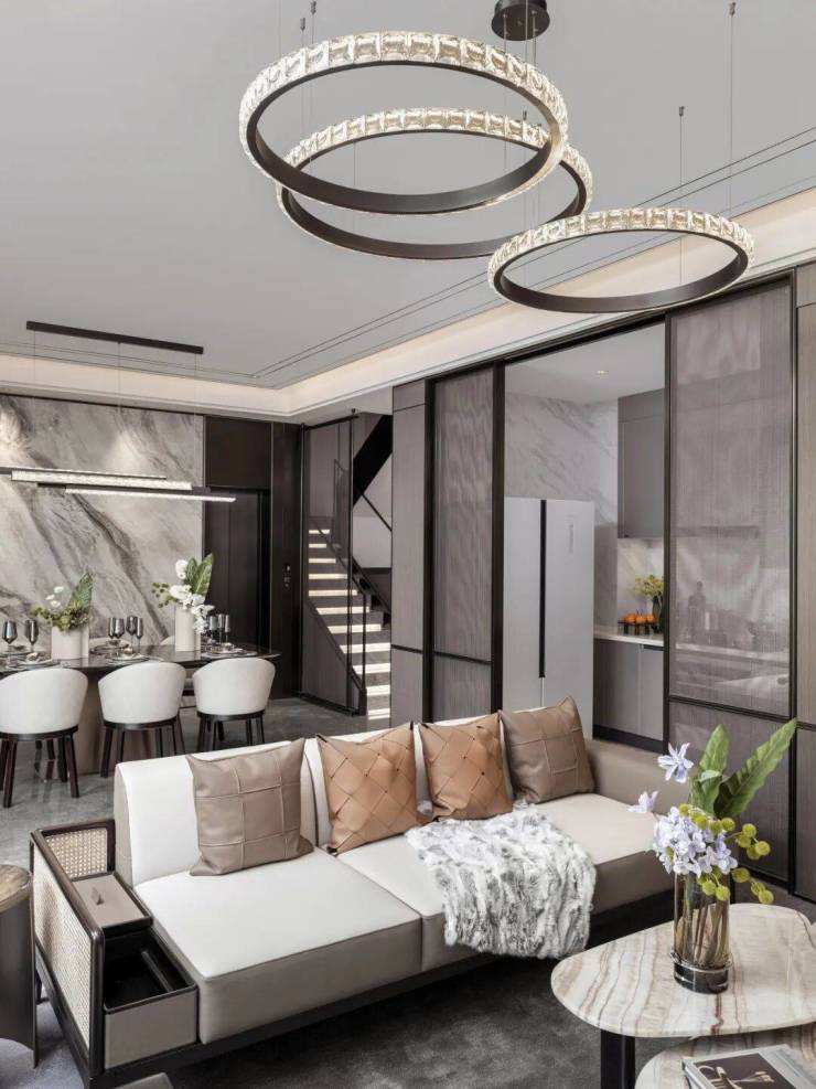 步入样板间所在的院落,现代东方语汇的设计给予室内空间贴合当代生活的可塑性。以意境感的黑白宁静为主色,设计师提取了珠宝中标志性的 “玉石”绿为跳色,搭配纯铜锻造的圆石,与大理石水景台构成的山水意向,让整体空间呈现出刚柔并济,现代东方雅奢的美感。在现有的186㎡与235㎡户型中,也兼顾不同人群对多样化空间的需求。位于一层的大尺度客餐厨空间兼顾会客聚餐及日常使用,也保留了能随时休憩的私人区域。