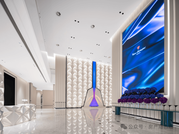 没有传统的沙盘和区位图,扑面而来的是挑高约11米的酒店式大堂、以兰博基尼超跑为灵感的艺术墙面、通铺意大利卡拉拉白奢石的走廊,以及训练有素的礼宾人员。