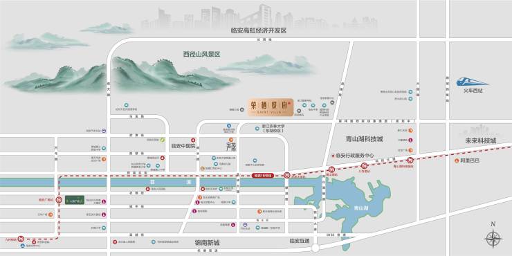 杭临快速路-留祥路西延快速路(规划)、临安南北高光主轴-农林大路、地铁16号线-农林大学站、青山湖站、青山湖隧道速达临安互通等,纵横路网,顺达全城。