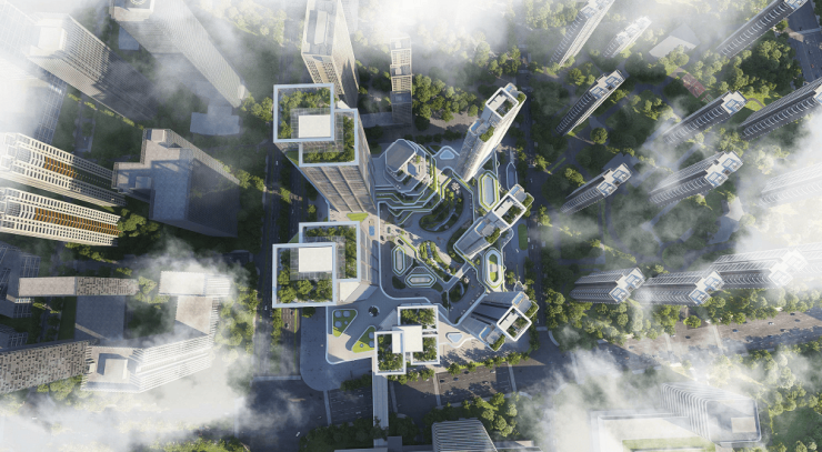 EIC项目的建筑设计极具现代感和未来感。六栋摩天建筑群高达200米,以弧形玻璃幕墙为主要元素,呈现出梦露裙摆式的流线造型,既优雅又充满力量感。双层幕墙结构不仅增强了建筑的保温隔热性能,还赋予了建筑独特的视觉效果。此外,EIC项目还引入了梯田理念,在有限的空间内创造出更多的使用面积,体现了高效利用土地的设计理念。