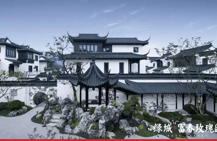 富春玫瑰园中国院子除传承绿城中式产品中的青瓦白墙、飞檐庑廊、影壁漏窗、水榭亭台等中式建筑元素外,为了不辜负从《富春山居图》中走出来的山水大境,在设计上我们还原苏州园林【园院宅阁】体系,极大限度的将富春山水收藏入室。