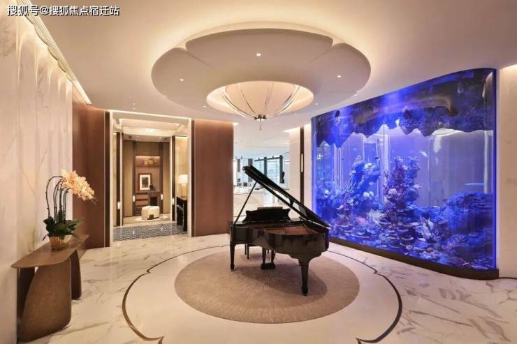 从盗梦空间来到少年派奇幻漂流中的发光海洋,弹着钢琴,看热带鱼群在珊瑚礁中穿行游弋,营造的是另一种梦境。整面深海鱼缸造价100万,因为70吨实在太重,限定8户,先到先得。这是双开装甲门进来的过厅,中央一台钢琴,左边是深海鱼缸,右边是鱼肚白拼接出的极富立体感的大鹏展翅,寓意着海纳百川、鹏程万里。