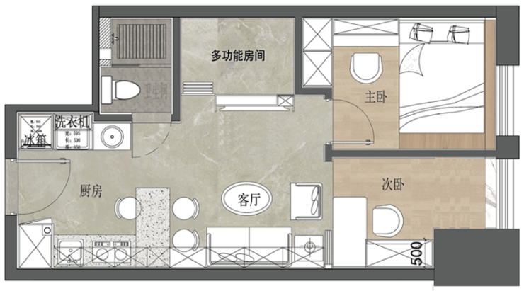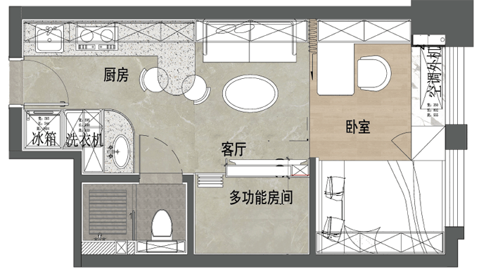 Living room「客厅」+Dining room「餐厅」+Kitchen「厨房」+Toilet「卫浴」,LDKT一体化设计。