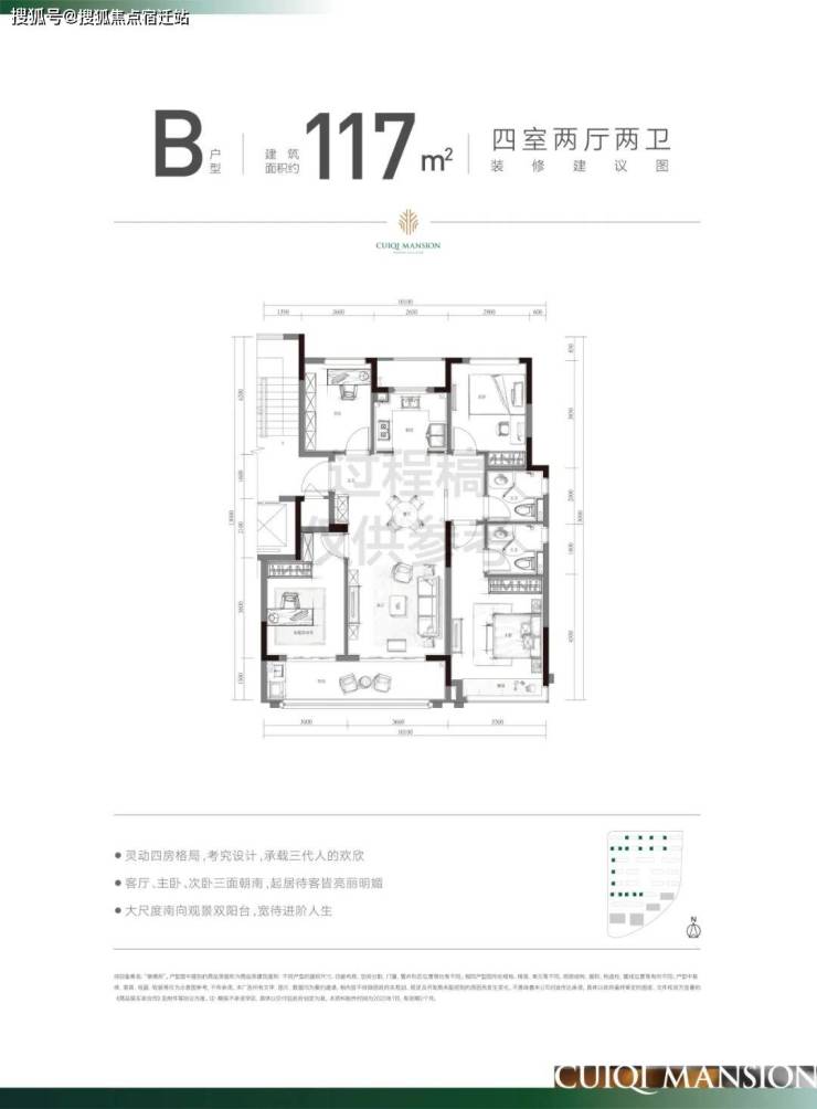 建面约128方采用了深受市场认可的经典的四叶草格局!这种户型的显著特点,就是消灭过道。客厅居于房子的中心,可以直接到达卧室、书房、厨房等各个空间。另外,4个功能间居于四角,对私密性的维护也和当下社会注重隐私的需求不谋而合,即使是孩子、长辈同住,也能有一个很好的家庭秩序。
