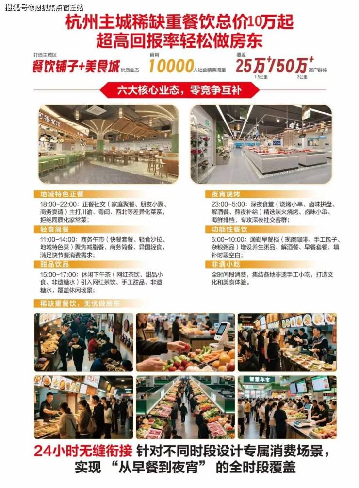【产品亮点】:主城稀缺可油烟重餐饮美食城,以及24 小时不间断服务 + 业态零重叠 + 产品独家性