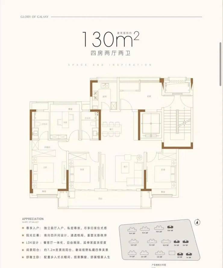 四开间朝南,四房两厅两卫设计,双阳台开间约7.2米,让整个户型的空间感放大的非常明显。