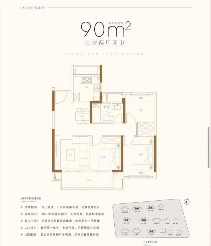 90㎡户型为项目首开的主力户型,三房两厅一卫设计,三开间朝南,较为方正,次卧和客厅双阳台设计,非常常规且实用的户型。