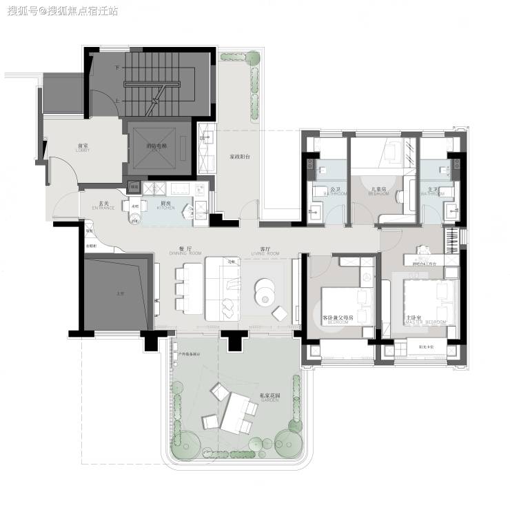 规划全龄段运动空间、亲子乐园等;把公园搬入小区内,植被疏密有致,一步一景。