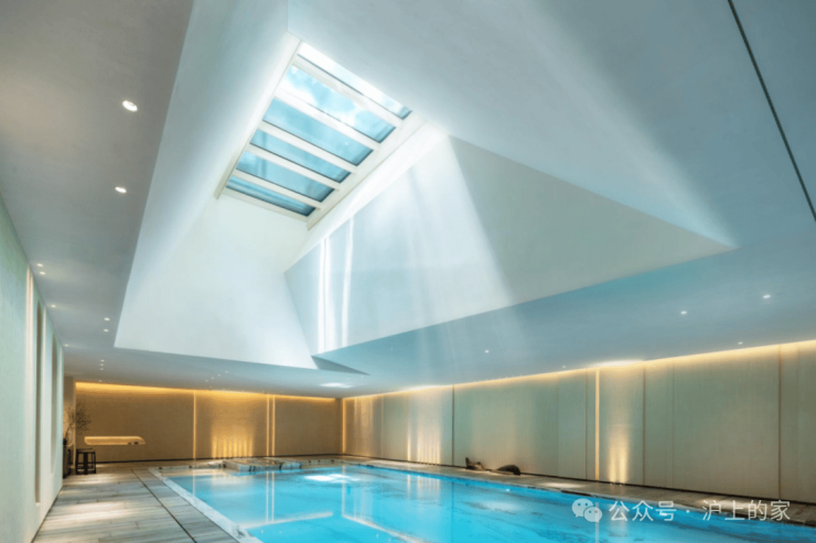 第三重,言上会己,专属于业主的惬意空间 。仿罗马浴场的泳池,让业主在这里自由放松和运动。整个空间,引自然光入室,天窗之上有水波,池面上是水影,在地下三层营造出一个山林间氛围,自然自在。