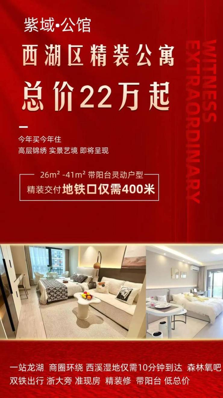 总价22万起,首付2万起,入主杭州西湖区地铁旁精装公寓——紫域公馆,以轻盈的姿态,为您开启安家杭州的全新可能。