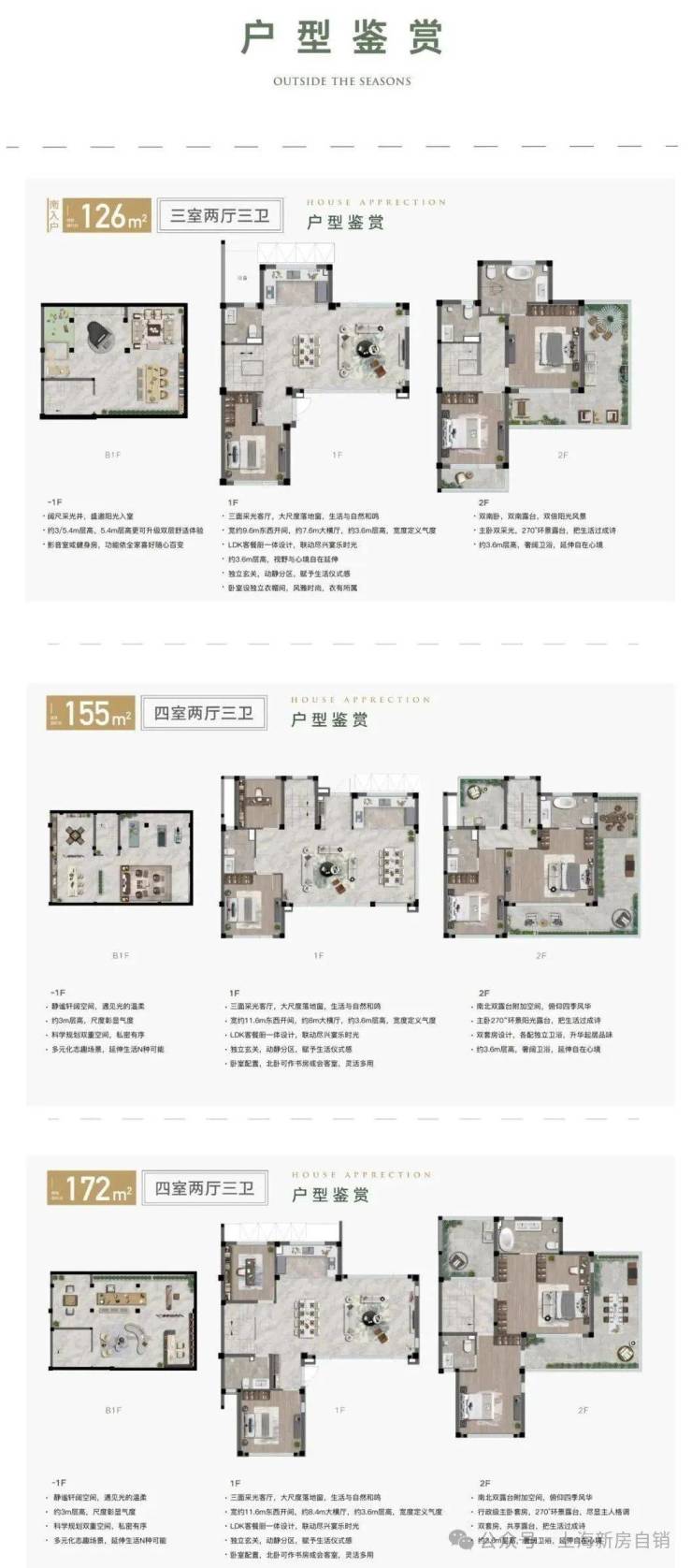 五个院子的别墅,以3层空间规制、超大附加面积,以约129㎡四合院为例,首层开间约12m,IMAX级三面采光,最大可享约26㎡转角露台,约70㎡的阳光地下室