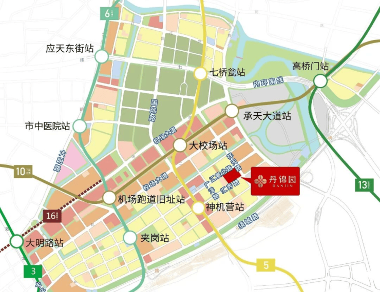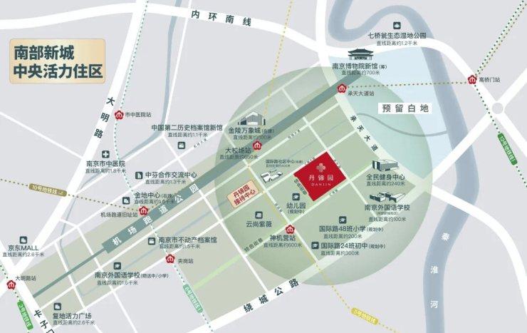 •便捷交通:片区内规划6线地铁,直线距离5号线神机营站约600米、在建10号线二期大校场站约650米;内部通过国际路和承天大道、校场大道连接应天高架、绕城公路、大明路、软件大道、卡子门大街等,快速通达全城。