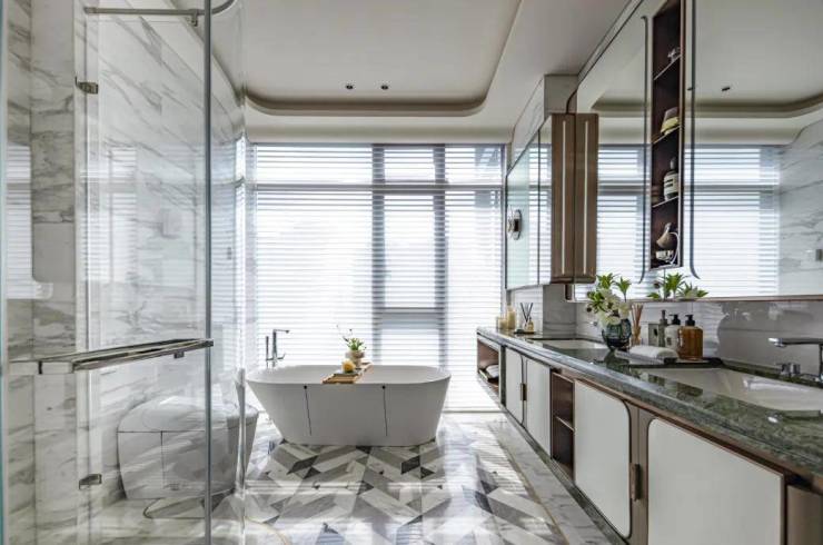 闲章」则拥有独特的动线和布局,打破「入户即厅」的传统思路,开门第一眼看到的是茶室,亦可设计成书房,营造极富隐奢之感的自我场域。双面转角窗设计演绎极佳的城市视野,先锋河、钱塘江一览无余,在都市繁华之中,勾勒一方心灵的宁静之地。
