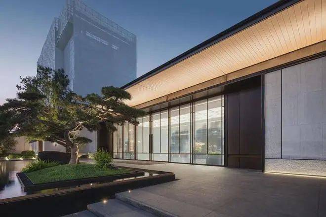 塔冠设计将中式屋檐与现代极简美学相融合,呈献极简东方的大美意象。外立面以昆石同色石头,搭配现代铝材、高透玻璃,焕新城市人文天际线。镂空金属、木纹铝板、错缝石材拼接,精奢演绎山水纹理,于细节处呈献精微与宏大的东方造物之境。