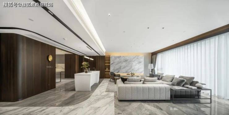 客厅背景墙更像是一场世界顶级石材展览,西边套用的是巴西进口石材天宝石,高贵中带着优雅;东边套用的是意大利卡拉拉大理石中的顶级「雕刻白」系列,我们熟知的世界著名雕塑《大卫》雕塑、世界著名建筑比萨斜塔等等,用的就是这一种石材。