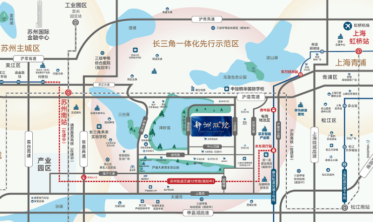 距苏州南站仅7公里,年底通车15分钟到虹桥;3分钟上高速,30分钟到虹桥;江浙沪两省一市,地铁无缝接轨。
