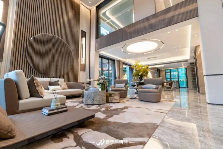金属+石材腰线,取意玉带缠腰,外立面大面积黄金麻石材,搭配深咖铝板,铝板上雕刻祥云纹,云藏龙,龙凤呈祥之意,这是福邸之宅。