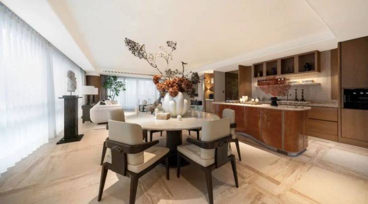 这个建面约176方的样板间,色彩清雅沉稳。电视背景墙的这片玉石,采用的是天然的玉石白冰玉,带冰裂纹和麟光,非常漂亮。要知道,迪拜阿玛尼酒店大堂的背景墙,用的就是这种石材。