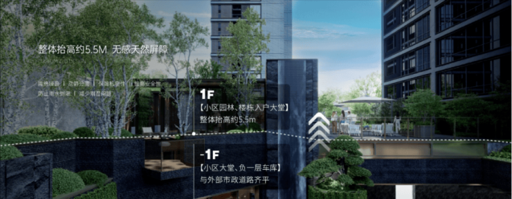 项目整体抬高约5.5米,不仅使项目整体山景视野更佳,同时也有隔绝噪音、保障私密性与安全性、减少潮湿等作用。