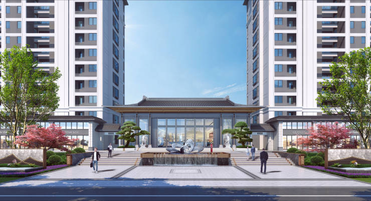 项目遵循“古韵今颜”设计理念,以平缓的几何线条,代替繁复的雕刻艺术,使之古朴而矜贵。遴选灰色石材、灰色铝板、灰瓦、大面积玻璃幕墙等,创新演绎盛唐建筑的全新风貌,凝萃私密、通透、无界等特点,迭新高端建筑美学。