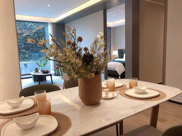 项目整体建筑风格取意千岛湖灵动山水,内敛、含蓄,以体现六合地产“尊重环境、尊自人文”的建筑理念,为繁华都市中的现代人打造一处放松身心、体验闲适生活的居住和度假场所,将自然生态融入建筑,最大程度保证居住者占有景观和亲近自然。