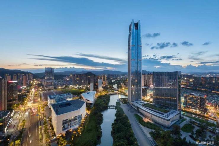 大面玻璃幕墙,香槟色铝板,精致石材,倒映九龙湖