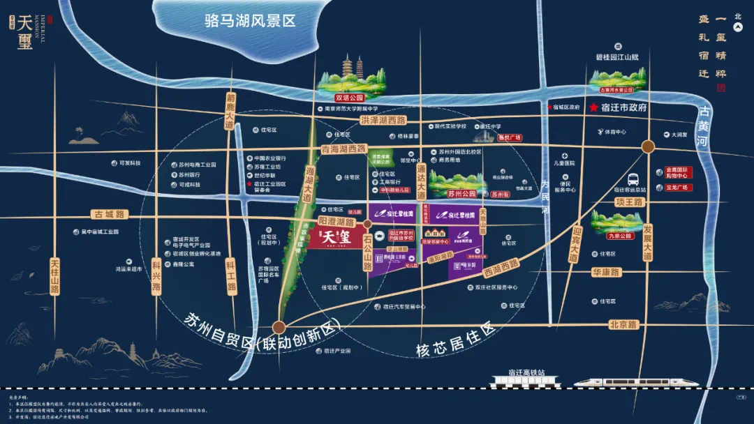 碧桂园·天玺位于江苏省宿迁市苏宿园区,紧邻苏州公园和苏州街,与苏州外国语学校仅一路之隔。项目运用传统文化延续,融合现代艺术,以城市上层主义尊贵理念仅为少数具有高品位的层峰人士打造的集地段、配套、环境和人文于一身的传世美宅。