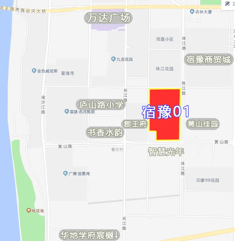 地块位于宿豫区,东至珠江路,南至黄山路、规划幼儿园,西至松花江路、规划幼儿园,北至庐山路。