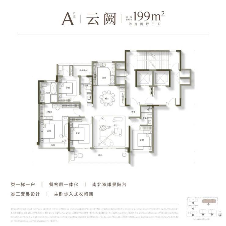户数少,是因为户型做的大。宸云所有高层,就只有约199㎡一个面积段。在此基础上,衍化出两个户型,都是四房两厅三卫双套房格局,南北通透,类独门独户,南向奢阔瞰景阳台,每一个都相当有“杀伤力”。