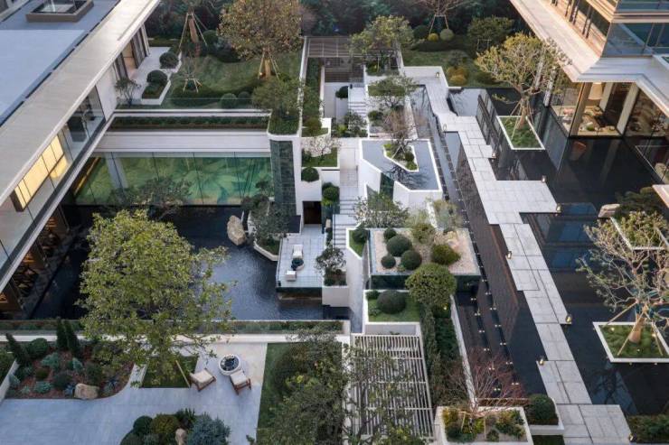 如果说户型是惊喜,那么沐芳洲的公区则更像是一种“越级享受”。项目创新性地将社区整体抬高了约3.8米,构筑了一座磅礴立体的 “生活浮岛”。这里没有传统社区的压抑感,取而代之的是媲美高端改善盘的“超级公区”——总面积超11000m²。