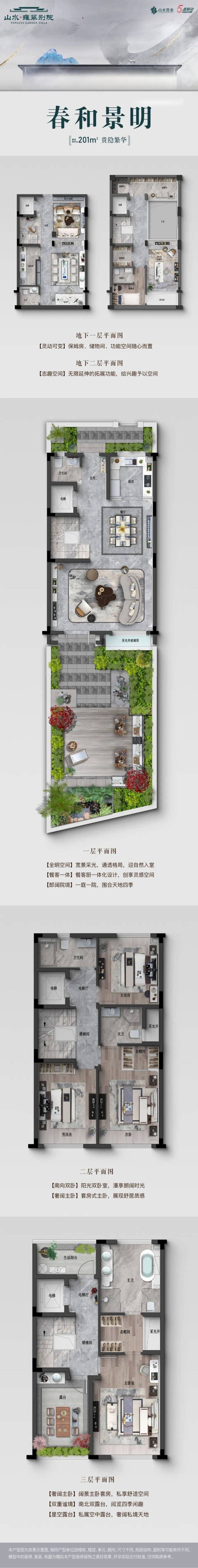 “春和景明”户型,建面约201㎡:一楼空间方正大气,客厅开间约6.6米,直通约66㎡户外大花园。二楼设计了三个房间,其中有两个套房。