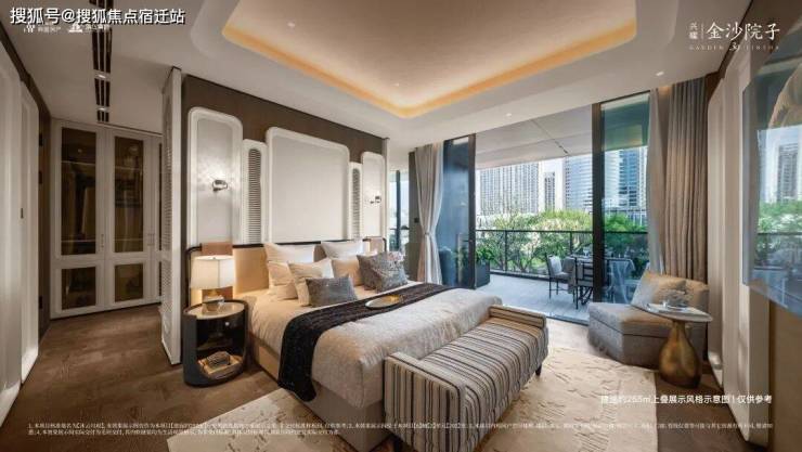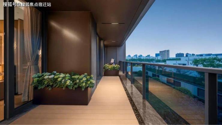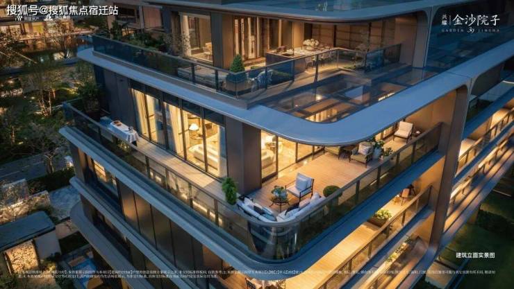当然为了区分南北,金沙院子的南侧阳台和露台转角,用了圆弧形玻璃栏板,这是很多豪宅都在做普及的设计风格,虽然成本很高,但是弱化了建筑的边界,更加温润。