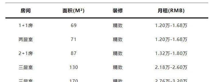 租金包含:物业、发票、宽带WiFi、每周2次打扫1次换洗布草、健身房等公区使用、24小时管家及安保服务;停车第一台800元/月,第二台1200元/月;可养宠物(需押金及清洁费)。