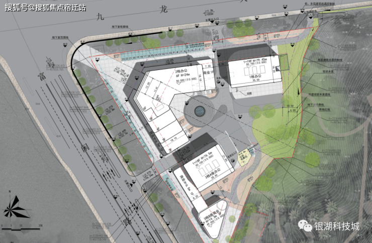 总平面图显示,项目由三栋办公楼和一栋商业楼以及裙房商业构成。