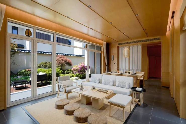 在屋内透过双腔中空玻璃落地窗向外望去,瞥见屋顶盖满湘湖里同款J型和瓦,木作采用“铝代木”工艺,建筑质量之高令人赞叹。