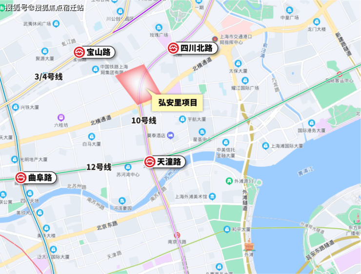 项目距离北外滩核心区,只隔了一条海宁路,距离外白渡桥、外滩源、苏州河都在直线约900米范围内。项目靠近轨交10号线四川北路站,周边还有3号线、4号线、12号线。